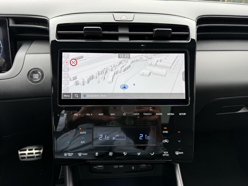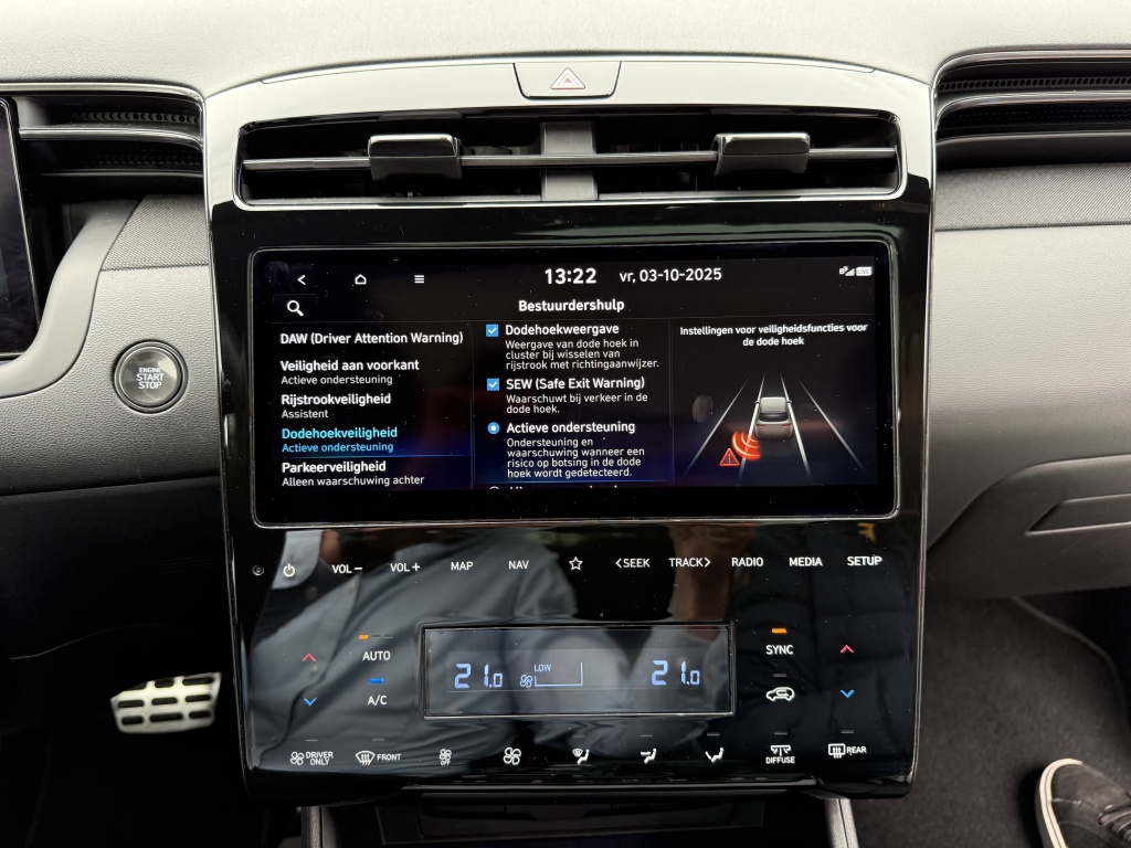 Deze Hyundai Tucson is voorzien van diverse luxe opties die het rijden niet alleen comfortabeler maken, maar ook veiliger. Zo beschikt de auto over adaptive cruise control met Stop&Go functie, wat ervoor zorgt dat je altijd op een veilige afstand van je voorganger blijft rijden, zelfs in druk verkeer. Daarnaast is de Tucson uitgerust met dodehoekdetectie met correctie, een waardevolle toevoeging die je attent maakt op voertuigen in je dode hoek en zelfs kan ingrijpen om een aanrijding te voorkomen.