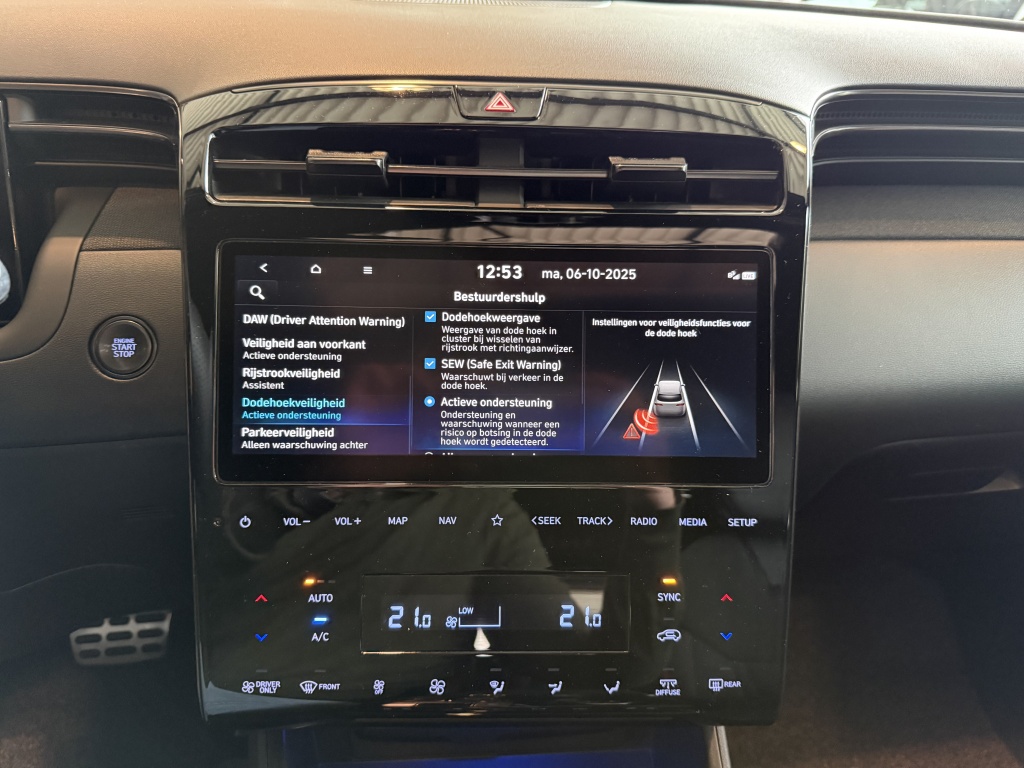 Een van de vele voordelen van deze Hyundai Tucson is de cruise control adaptief met Stop&Go functie, waardoor u comfortabel en veilig lange afstanden kunt afleggen. Daarnaast zorgen de dodehoekdetectie met correctie en de rondomzicht camera ervoor dat u altijd goed zicht heeft op uw omgeving, wat bijdraagt aan uw rijveiligheid.